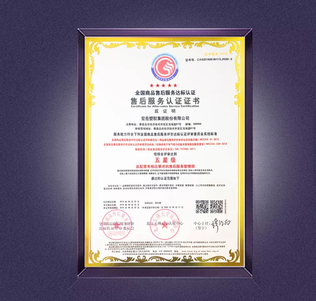 8月22日,97视频塑膠集團股份有限公司通過全國商品售後服務達標認證,獲得五星級售後服務認證證書(shū)。
