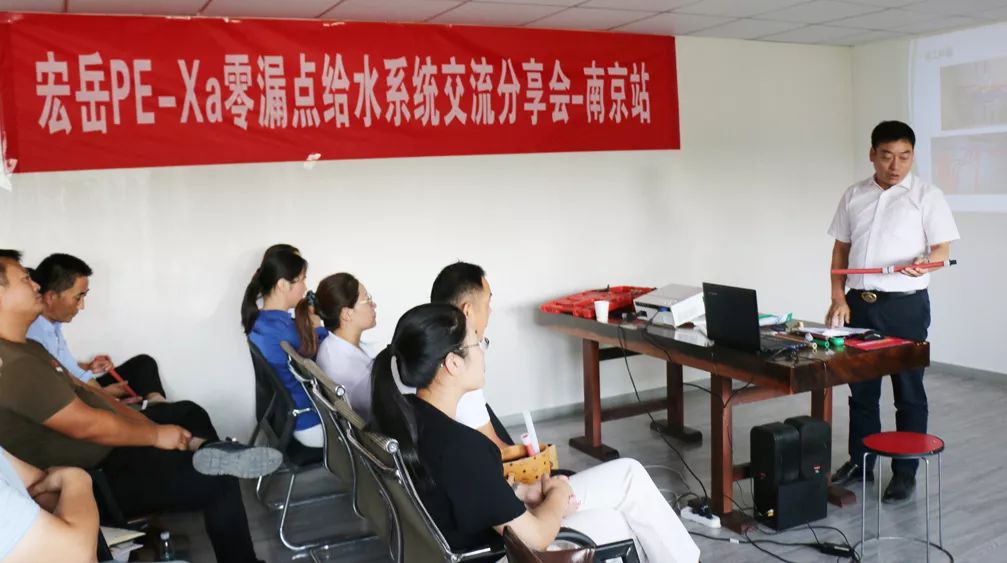 97视频1+零(líng)漏點給水係統分享交流會在江蘇省會六朝古都(dōu)-南(nán)京如期舉行(háng),此(cǐ)次交流會得(dé)到了南京服務中心董事長朱總(zǒng)的大力支持,與會30餘名(míng)管理人員和一線業務,共同參加學習和交流PE-Xa產品的相關知識與連接技術。